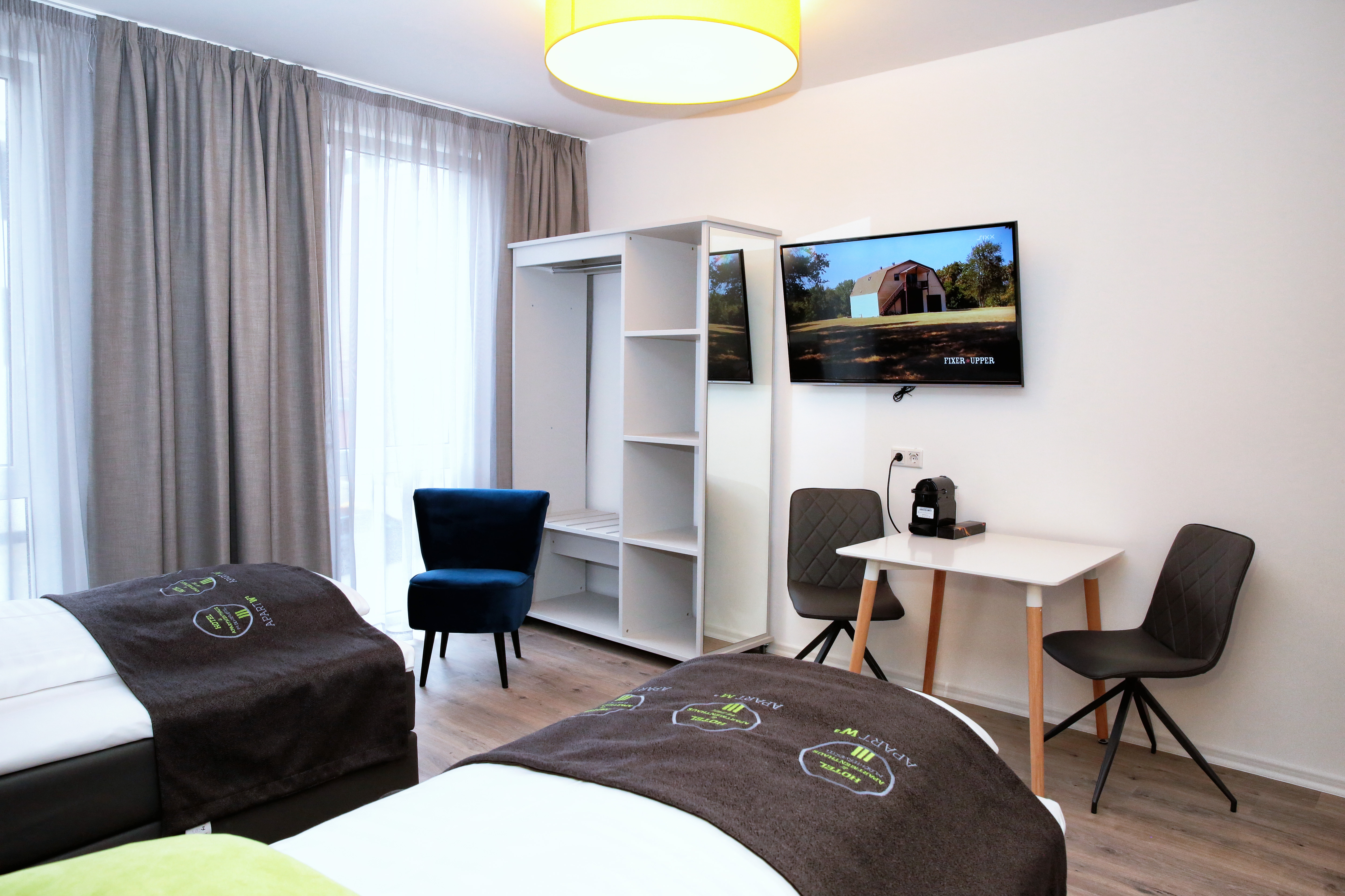 Alle Zimmer sind mit hochwertigem Boxspringbett (made in Germany), Dusche / WC, Fön, Flachbildschirm TV, Kabel TV, Nespresso Kaffeemaschine, Wasserkocher und W-LAN ausgestattet.Alle Preise verstehen sich pro Zimmer und Nacht zzgl. Frühstücksbuffet. Alle angegebenen Preise beinhalten die gesetzliche Mehrwertsteuer. Die Preise ändern sich gegebenenfalls bei Messen, Kongressen und Veranstaltungen.